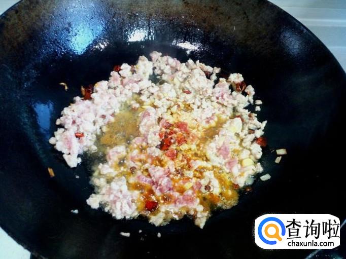 锅内放入油加热,油热后放入花椒,红干椒,葱,姜,蒜爆锅,随即放入肉末小火翻炒,放入少许料酒,酱油(不用放盐)。