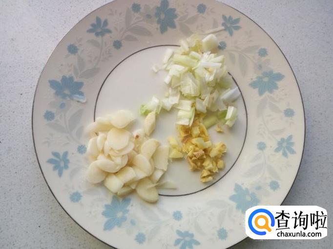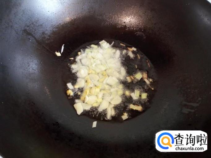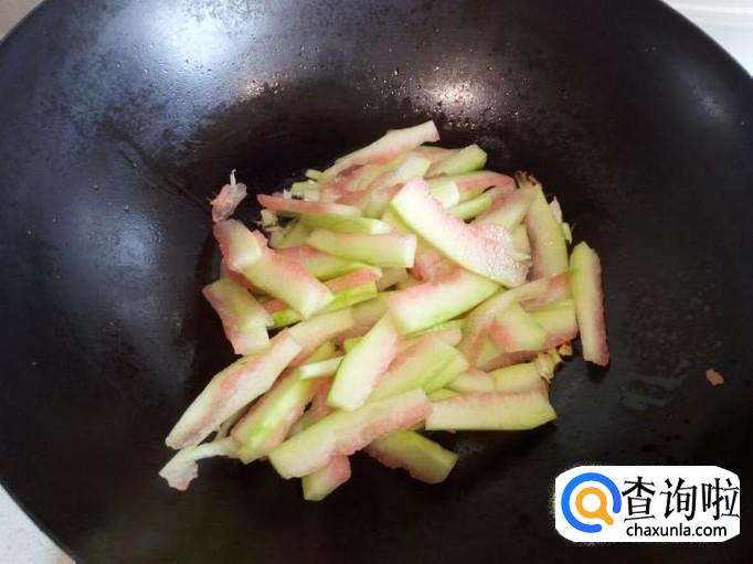 锅内放入油加热,油热后放入葱,姜,蒜,炒香。随即放入西瓜皮翻炒。