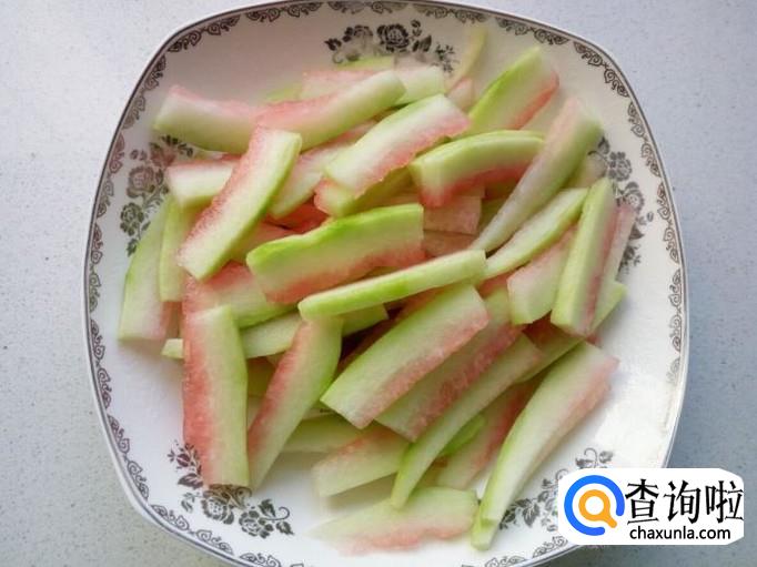 把西瓜皮外层的绿色硬皮去掉,然后用水冲洗一下,控干水分,切成条。
