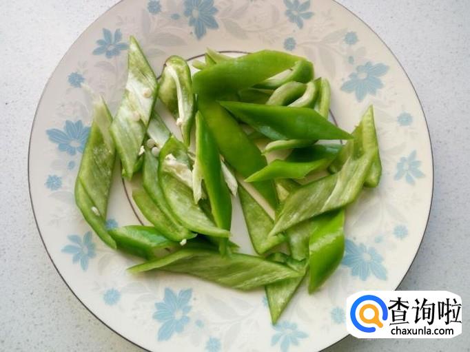 青尖椒用水清洗干净,控干水分,切成菱形片。