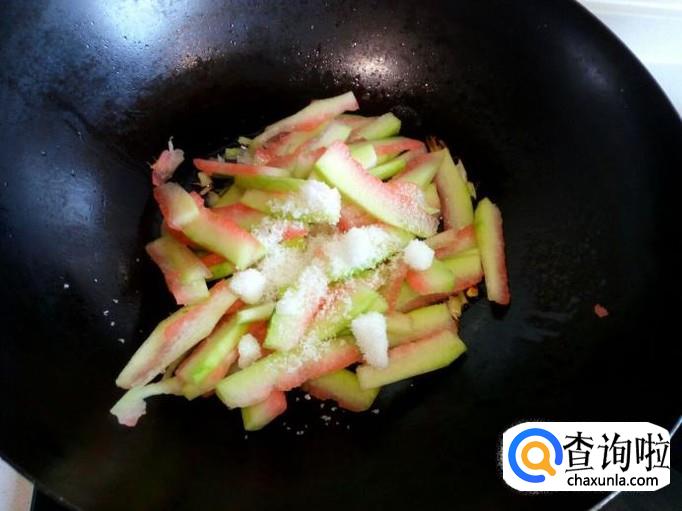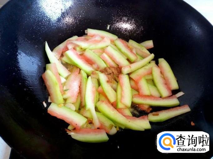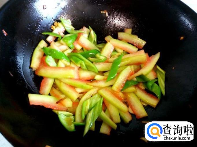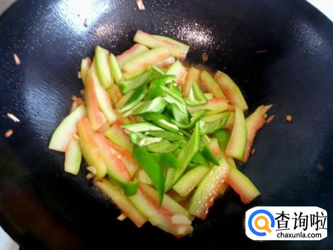 西瓜皮稍翻炒后,放入五香粉,盐,放入青尖椒翻炒。