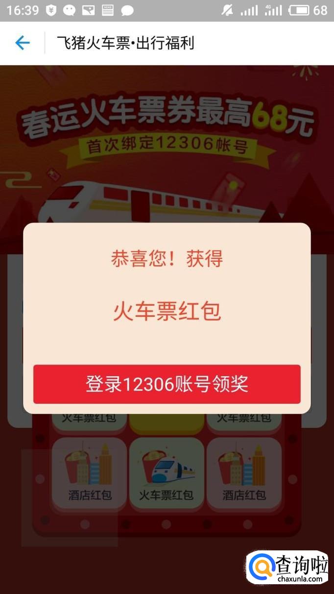 抽奖成功后我们可以看到已经领取了红包,然后点击下方登录12306领取红包。
