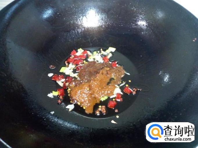 锅内放入油加热,油不要太多,油热后放入花椒,红干椒,葱,姜,爆香。放入两匙儿豆酱翻炒。