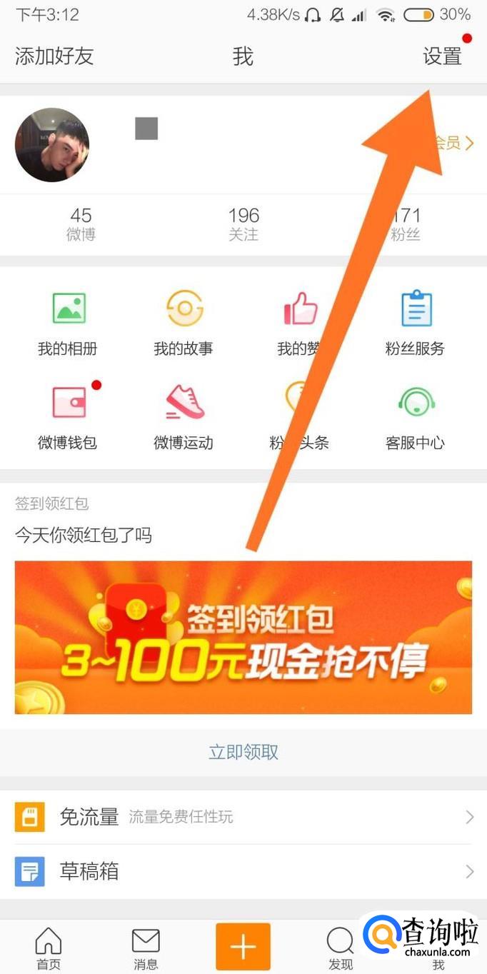 首先进入微博页面“我”,然后点击进入右上角的“设置”。