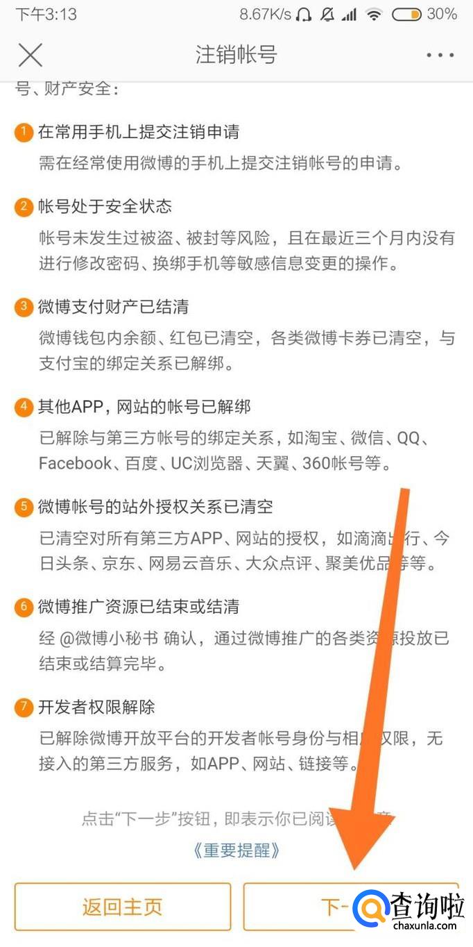 确认符号注销条件后,点击“下一步”按钮即可注销微博账号。