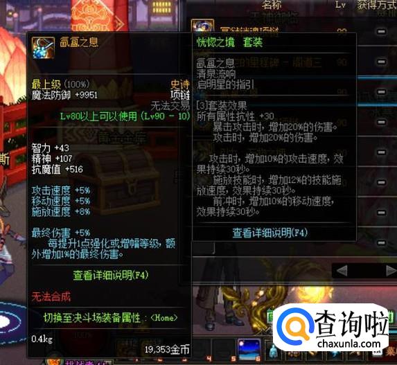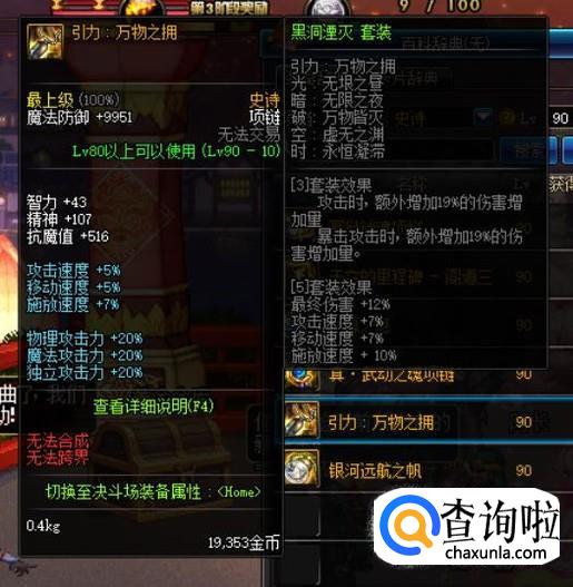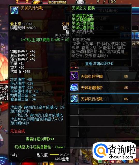 至于防具方面,遵循着“齐什么,升什么”的原则,毕竟集齐一套90级史诗A套是一件很不容易的事情,而在90级史诗防具套装没有集齐之前,可以选择天御套装,该套装是85级史诗防具套装中,唯一一套可以媲美90级史诗A套的存在。