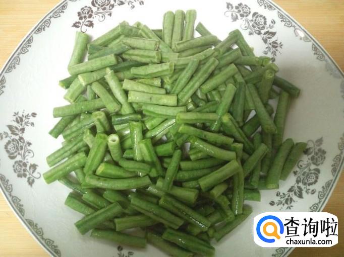 豇豆收拾清洗干净,控干水分,切成寸段。