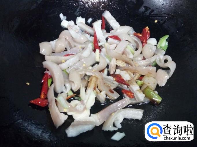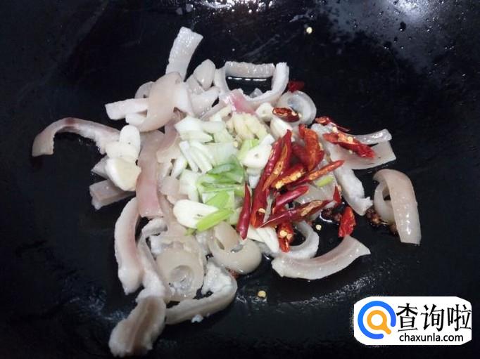 锅里放入油加热,油热后放入花椒爆锅,放入肉皮翻炒。放入葱,姜,蒜,红干椒,料酒,少许酱油。