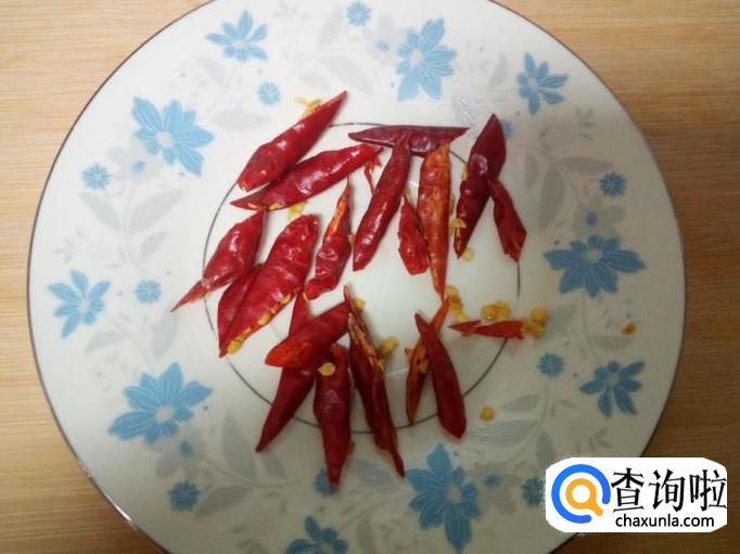 红干椒用水清洗干净,控干水分,斜刀切成段。