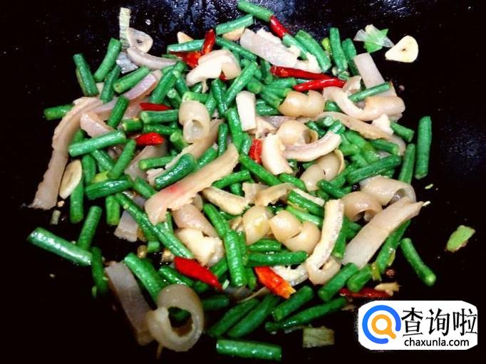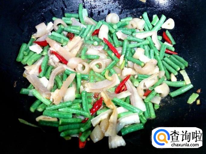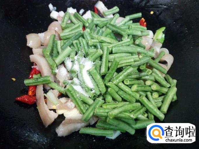 随即放入豇豆翻炒,放入盐。翻炒时适量放些水翻炒,避免肉皮粘粘。