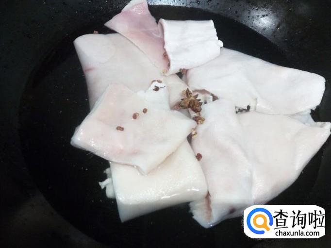 肉皮收拾清洗干净,控干水分。放入冷水锅中,放入少许盐,料酒,花椒,八角,大火烧开,转小火慢煮。大约煮20分钟左右的时间(用筷子可以插透),关火。