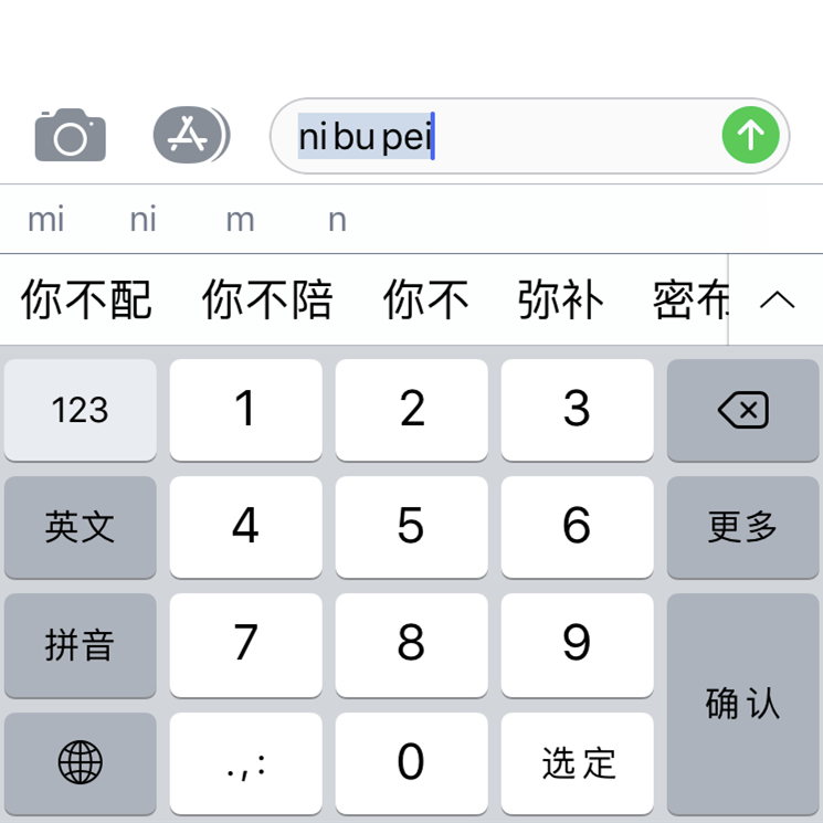 用九宫格输入法输入“6428734”,就会出现“你不配”三个字,婉转拒绝别人的意思。