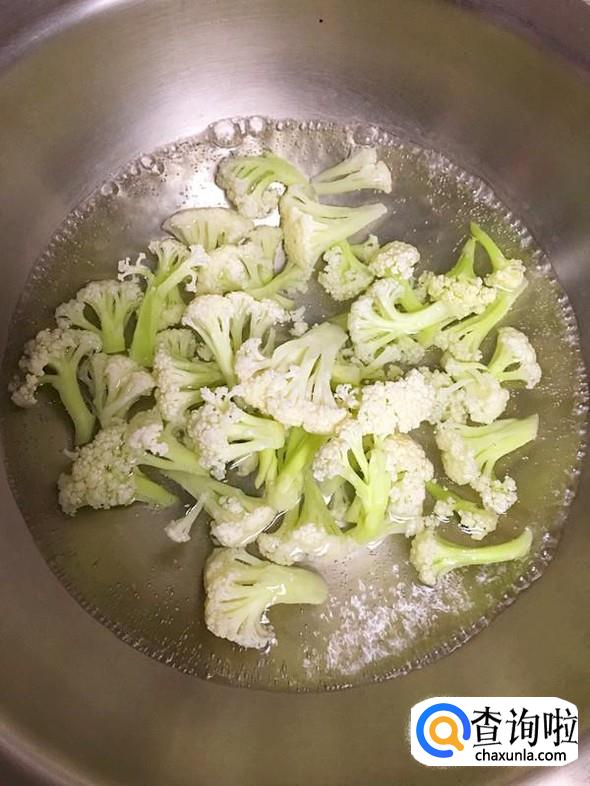 花菜掰成小朵,冲洗干净后放入淡盐水中浸泡5分钟左右。
