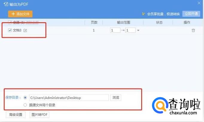 接着会跳出一个对话窗口,在需要转换为PDF的文档前面的方框里划对号,然后再选择转换为PDF文件后,所存储的位置,小编这里将它存为桌面了,然后再点击“开始输出”。