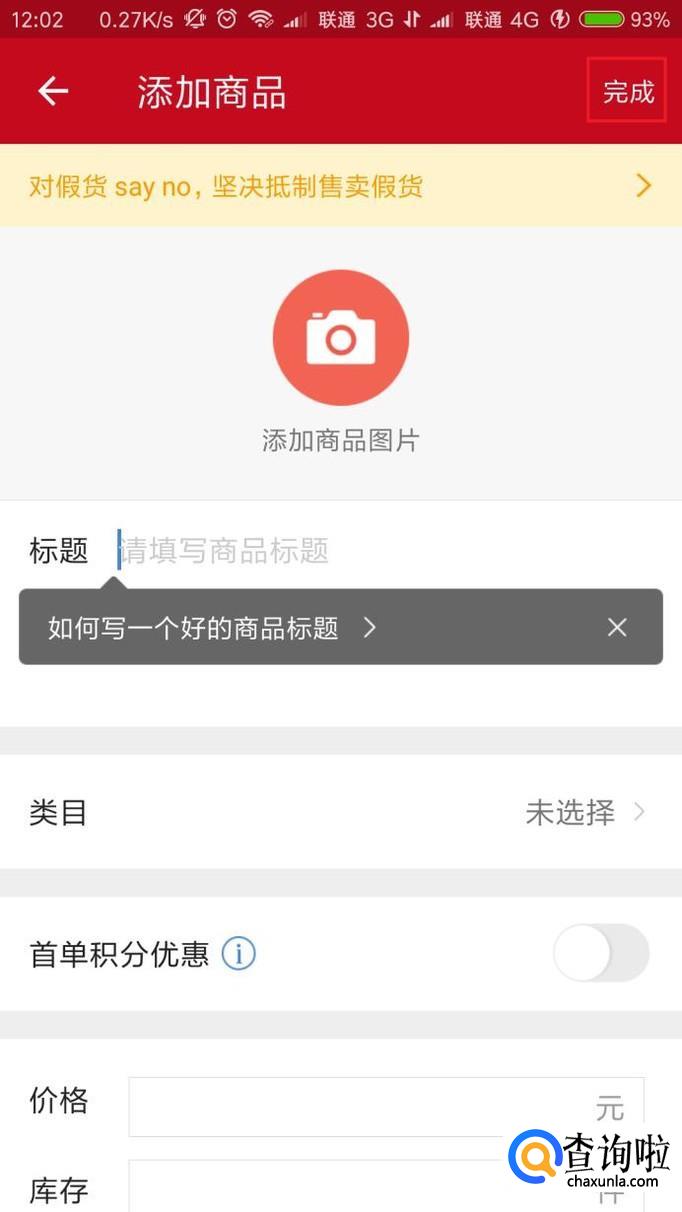 最后,我们完成商品标题、图片、价格、库存等内容的填写,点击页面右上角“完成”按钮即可完成商品的发布,等系统审核完毕之后就可以在店铺中看到已经发布的商品了。