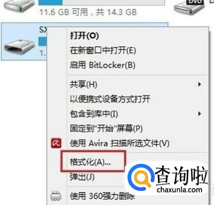 可以看计算机上所安装的磁盘,选择除C盘外的希望进行格式化操作的硬盘,右击一下磁盘,弹出如图对话框,单击“格式化”。