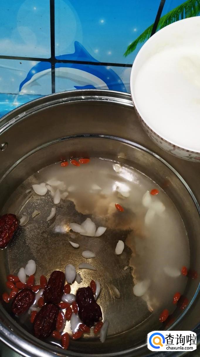 汤锅中放入适量清水,先将百合倒入锅中,再将泡好的枸杞子和红枣也倒入锅中。