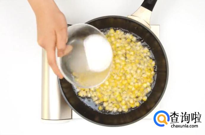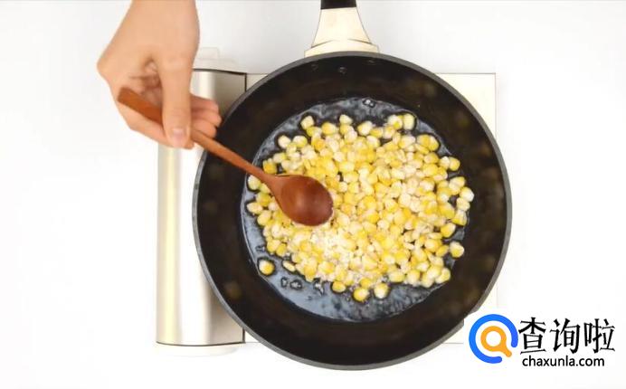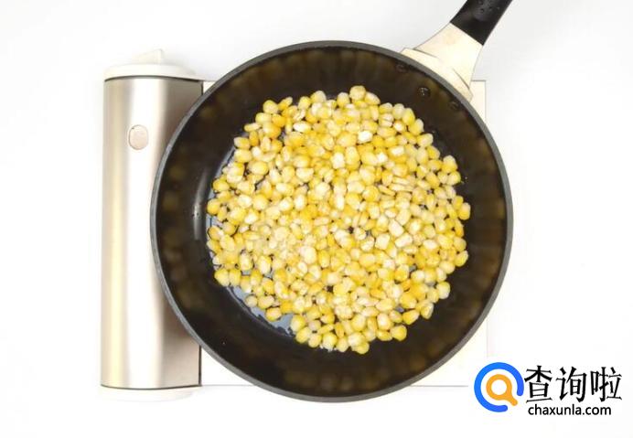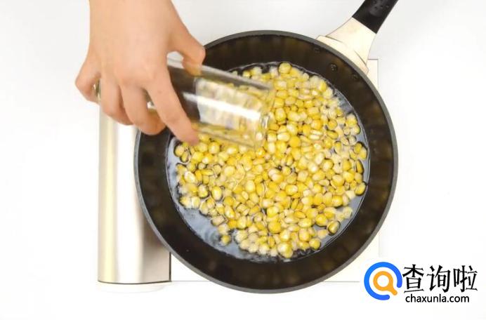 冷锅热油,倒入玉米粒。