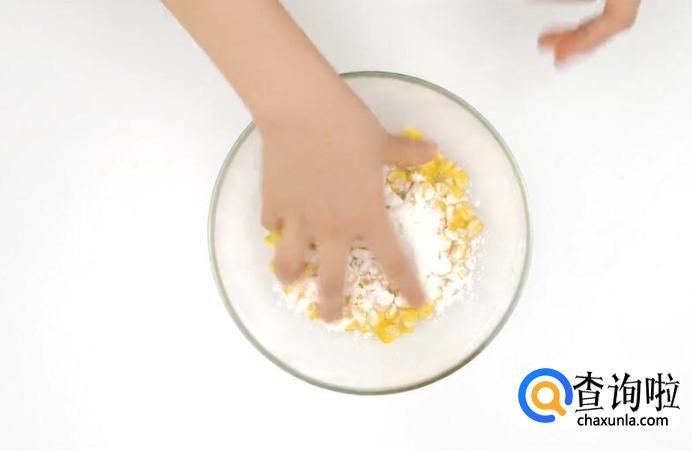 炸至玉米变色,倒入水淀粉(10g淀粉、5g糯米粉、150毫升水)。