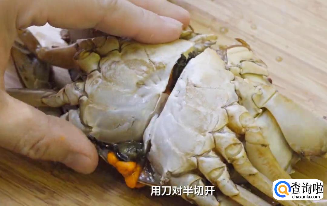 将膏蟹洗干净后,取出肚子上的壳盖,然后对半切开。