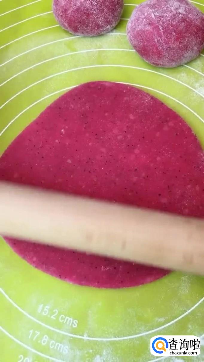 接着用擀面杖,把材料擀成饼状,如下图所示。