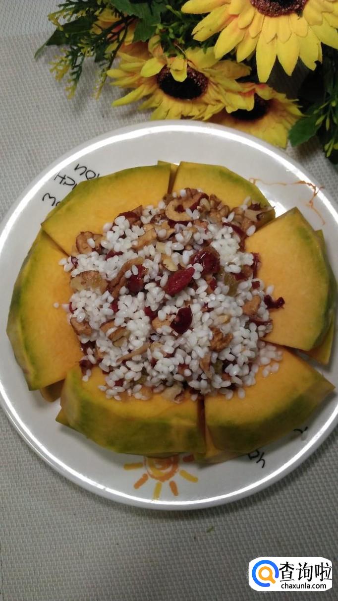 南瓜适量,糯米适量,大枣适量,葡萄干适量,核桃仁适量,白砂糖适量。