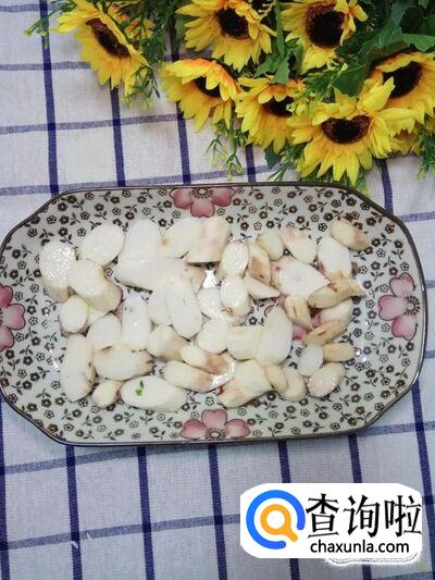 准备适量山药,洗净,去皮后切成小段,放入盘中备用,一定不要怕麻烦,同时要保护好自己,不要让山药的粘液沾到手上。