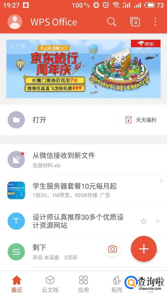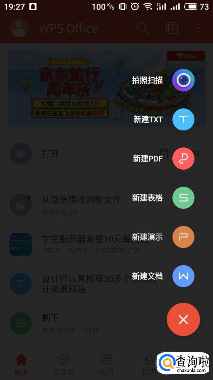 在应用商店搜索下载安装WPS OFFICE,安装后点击进入,选择“+”