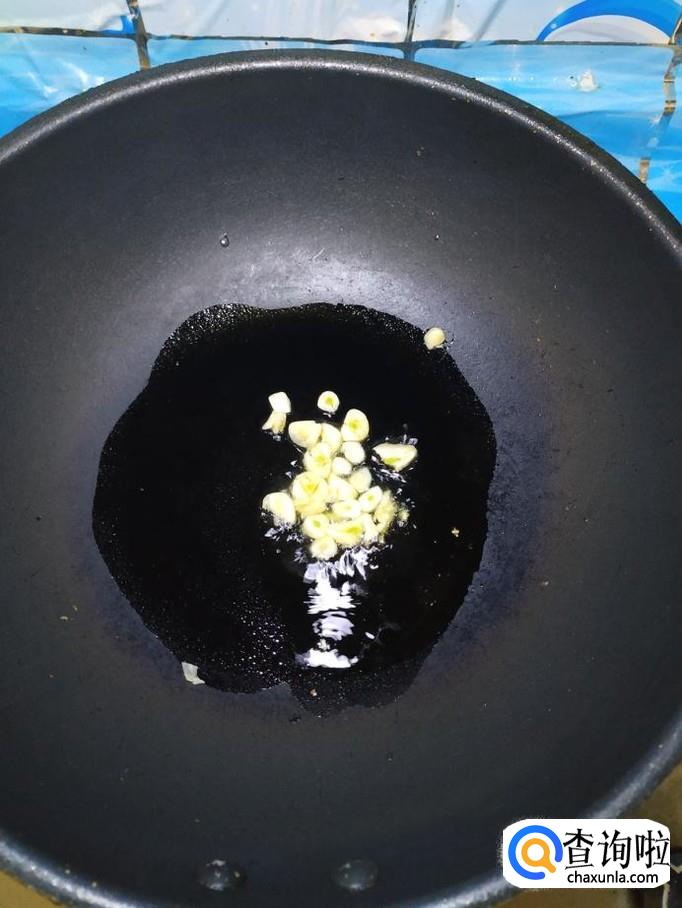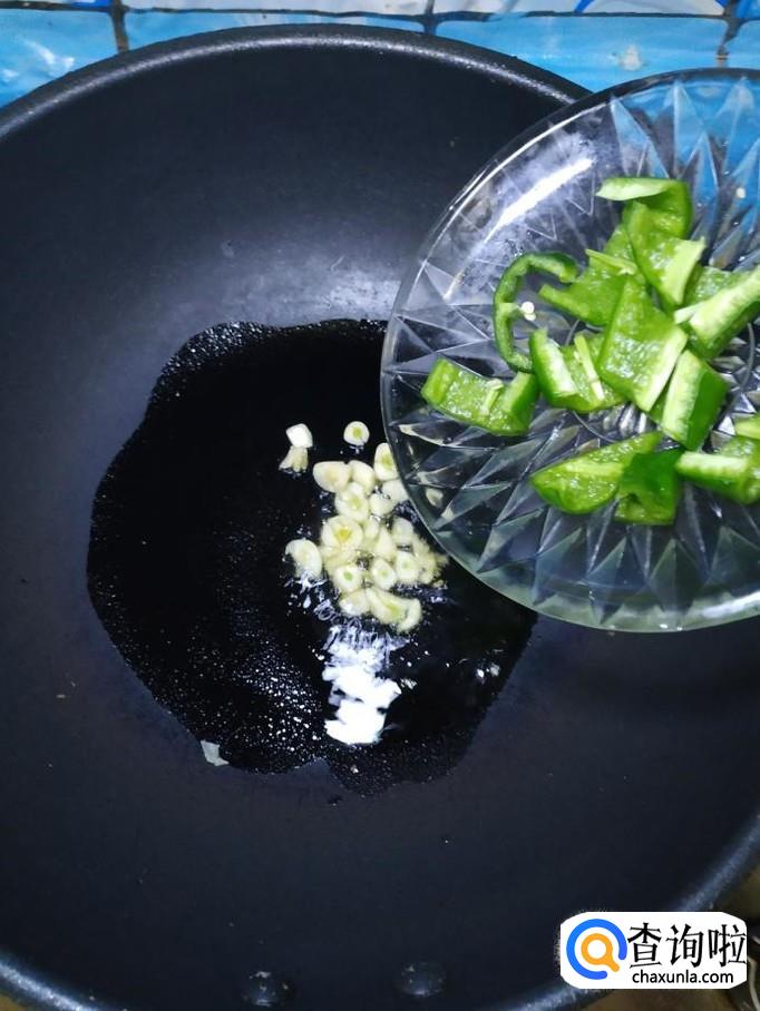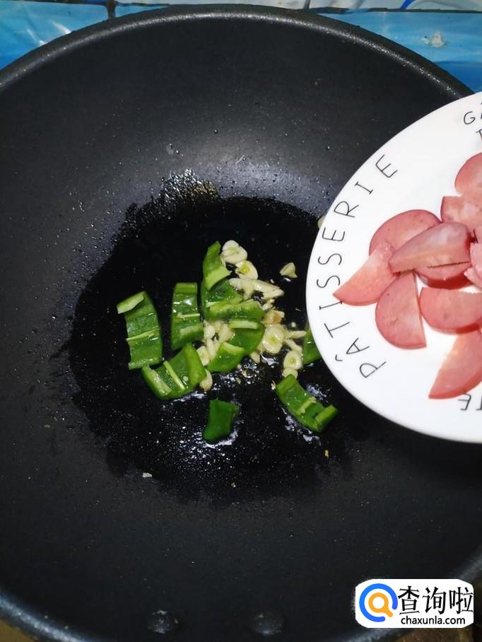 准备适量蒜,去除外衣后,切成片,炒锅中放入适量油,油热后,将蒜片放入锅中炒香,然后将青椒片和红肠片,倒入锅中,翻炒均匀。