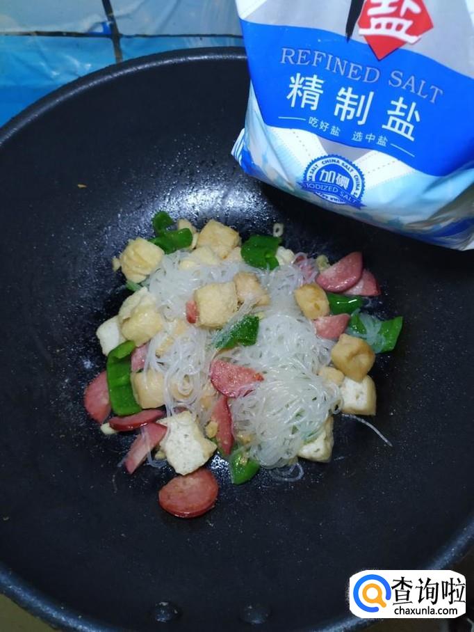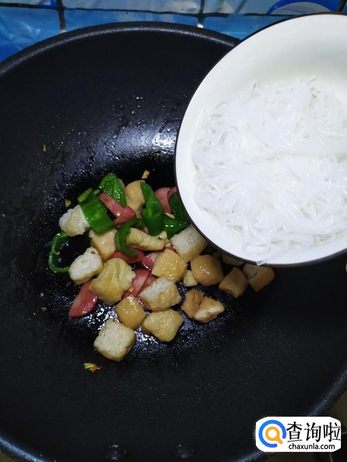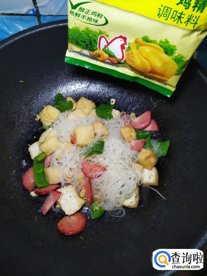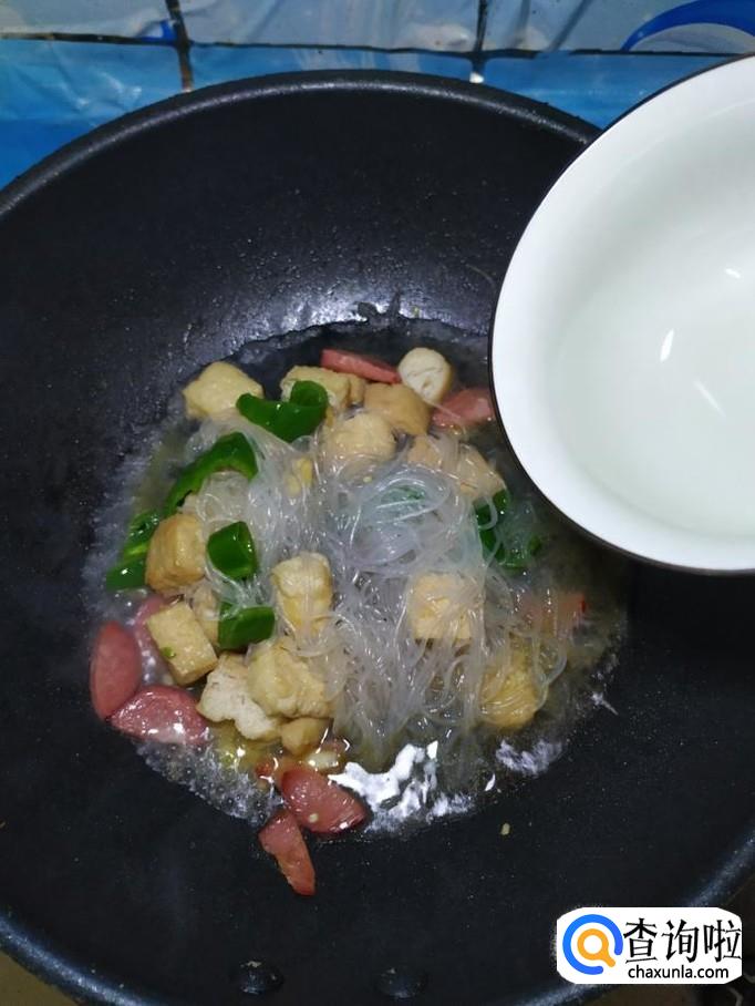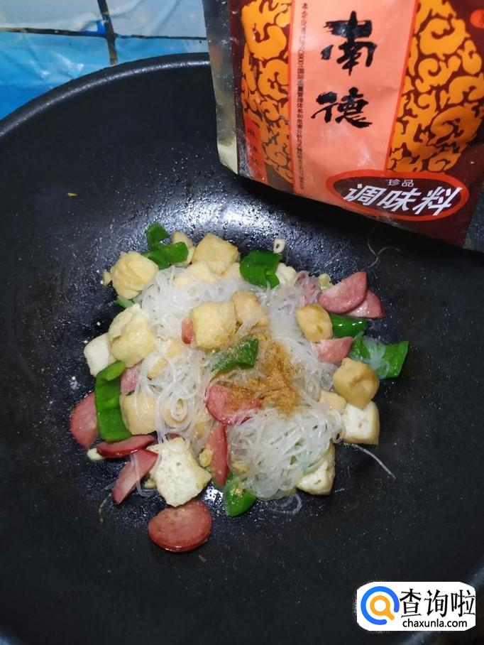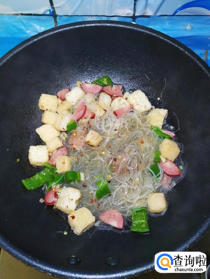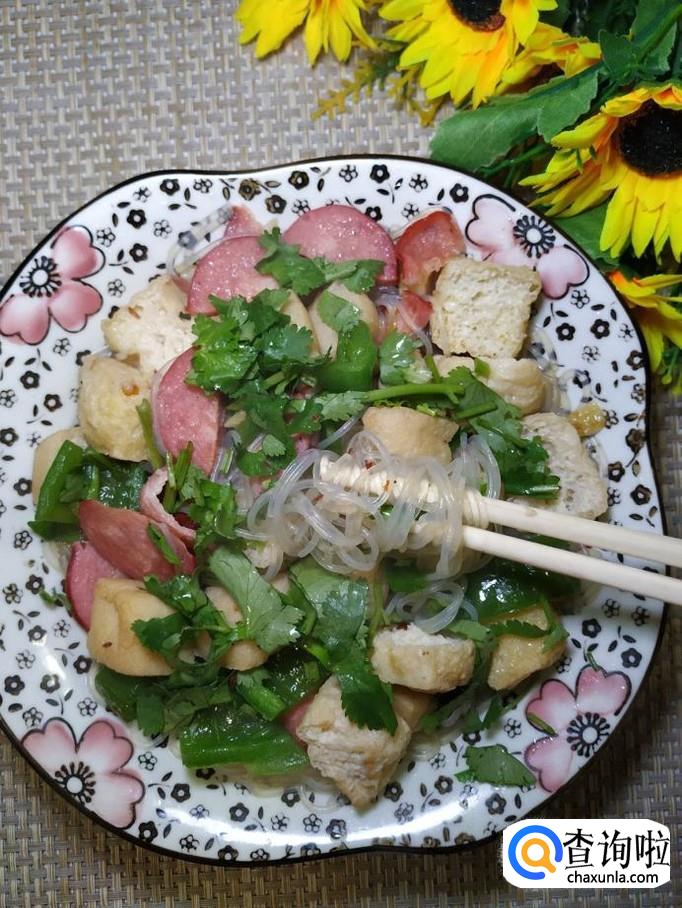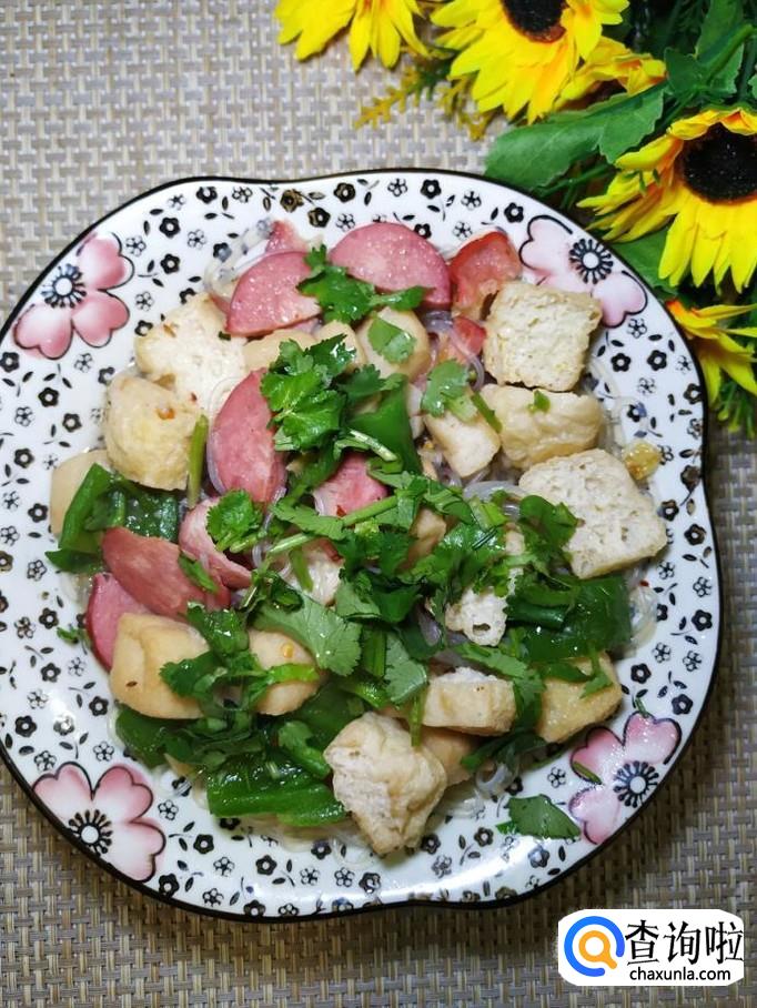 油豆腐适量,香肠适量,青椒适量,绿豆粉丝适量,香菜适量,盐适量,鸡精适量,五香粉适量,辣椒末适量,白胡椒粉适量,蒜适量。
