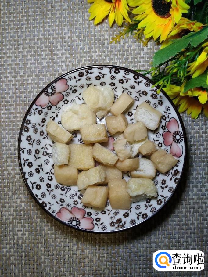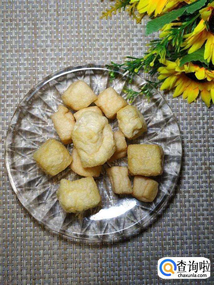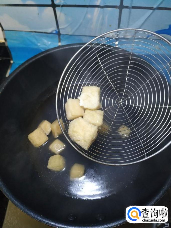 准备适量油豆腐,放入锅中焯水,捞出后,用刀切开,这样便于入味。