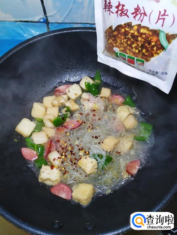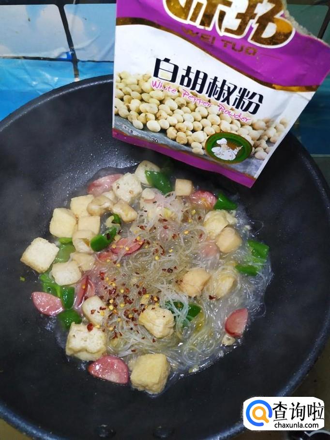 加入一小碗清水,再加入适量辣椒末和白胡椒粉,盖上锅盖,炖三分钟左右。