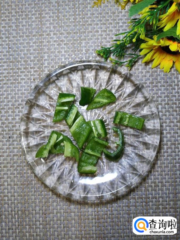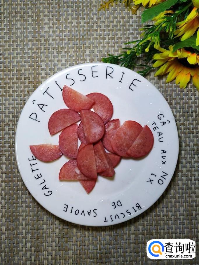准备适量红肠,切成片,再准备适量青椒,洗净后切成片,分别放入盘中备用。