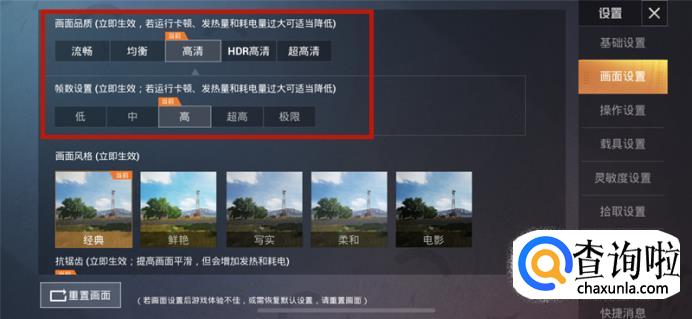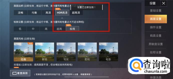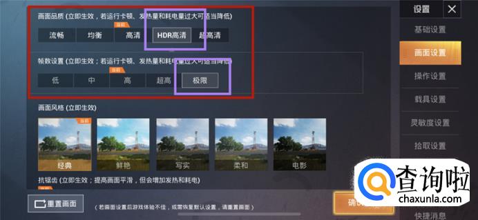 在画面品质中选择“HDR高清”,在帧数设置中选择“极限”。