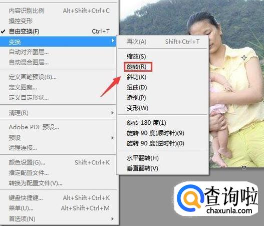 我们按下Ctrl+T键然后再在编辑菜单里找到变换里的旋转,如图所示: