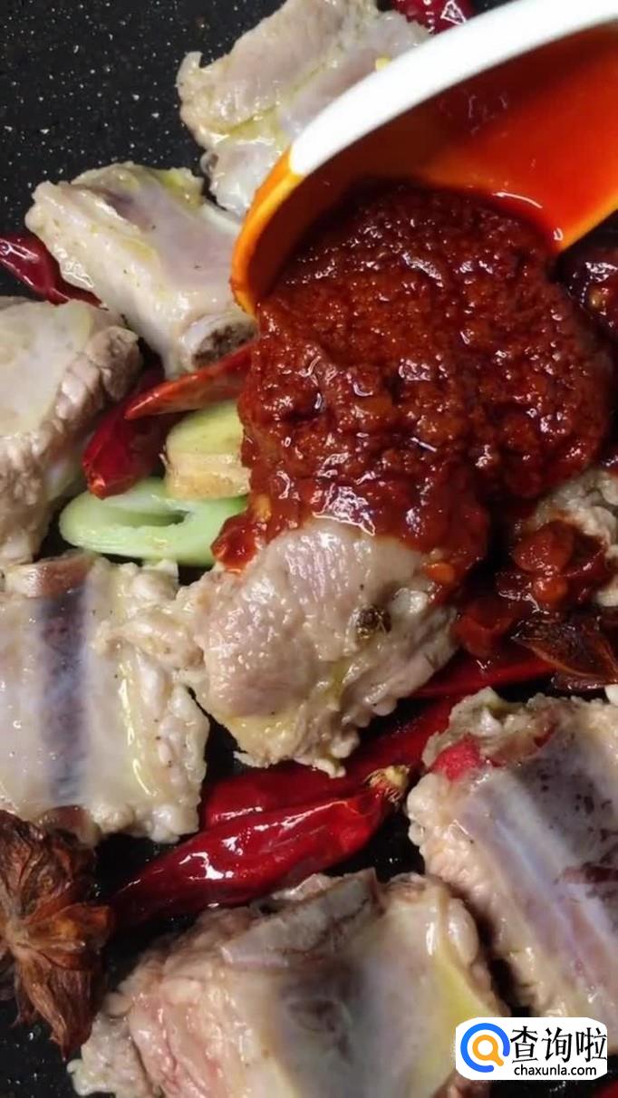 然后往锅中加入一勺的辣椒酱,如下图所示。