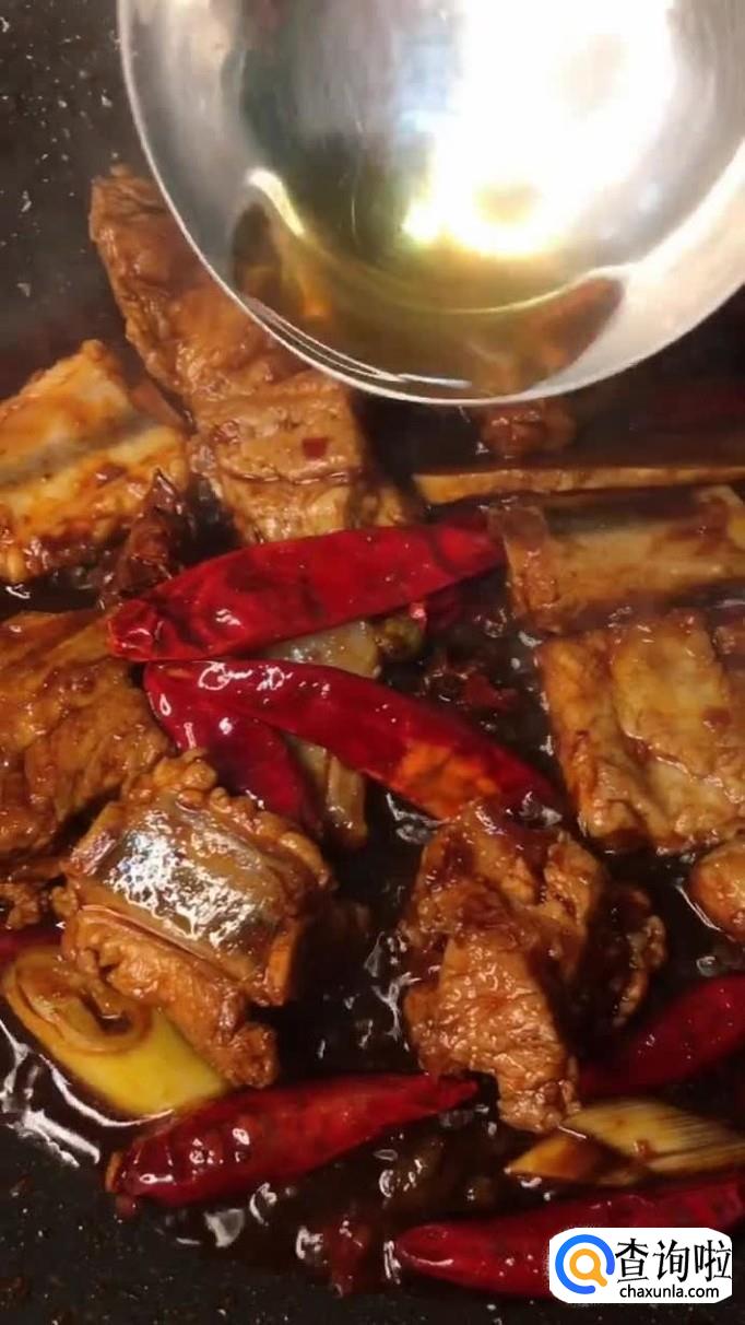 接着把排骨倒入锅中翻炒两分钟,加入适量的生姜、八角、干辣椒和大蒜,翻炒三分钟,如下图所示。