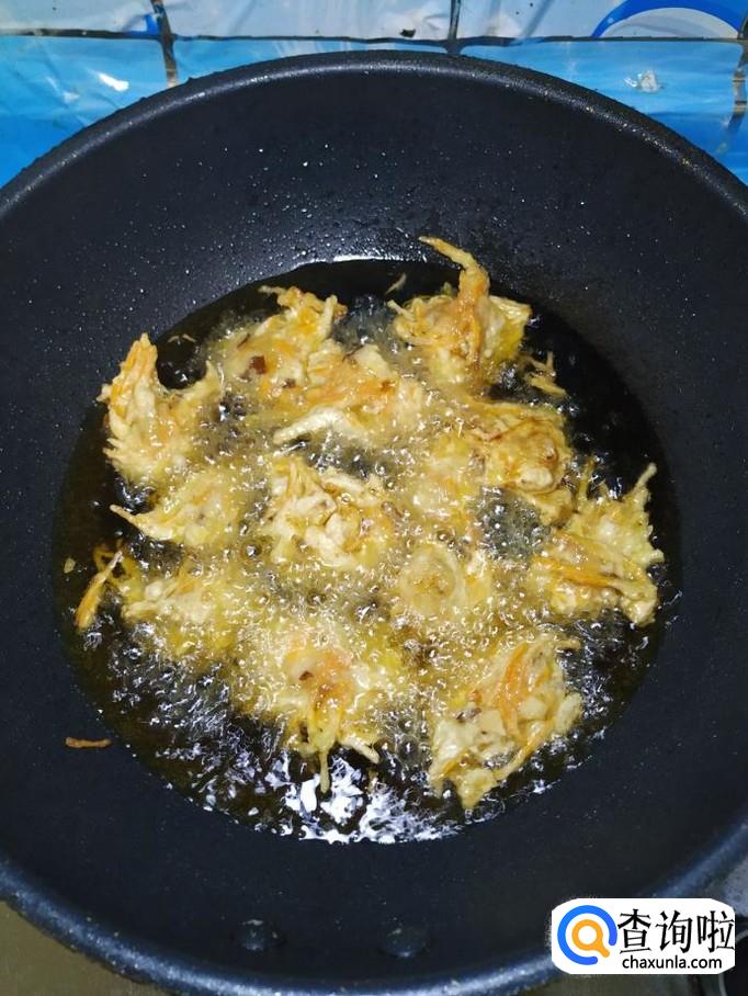 炒锅中放入适量油,油热后,用勺子挖成丸子状,放入锅中,全部做成丸子,小火慢炸。
