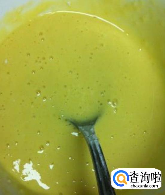 然后再将蛋黄、牛奶和面粉加入,下面是蛋黄、牛奶和面粉搅拌均匀后的样子。