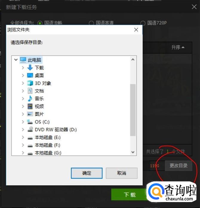 在下载界面,单击更改目录,弹出文件夹浏览窗口