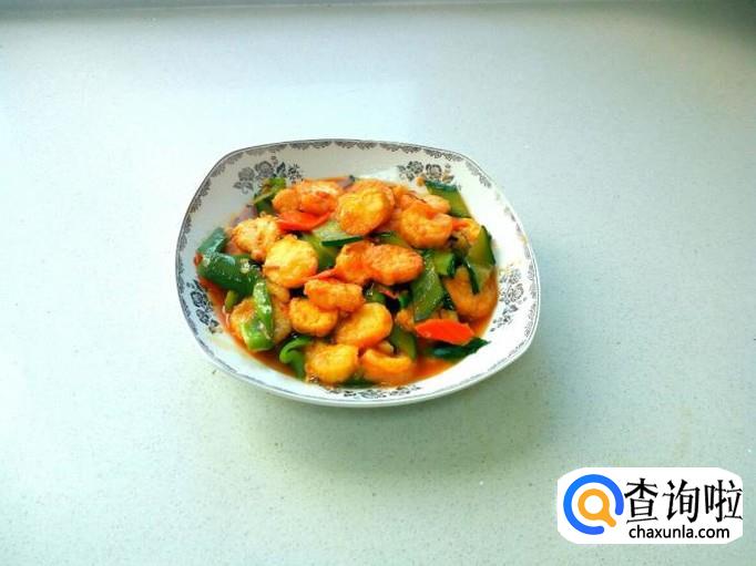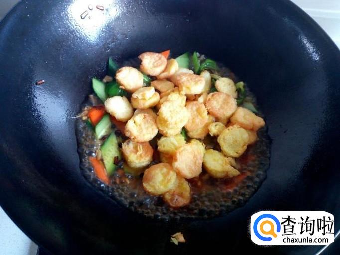 黄瓜,青椒片略翻炒一下,放入调和好的料汁烧开,然后放入煎炸好的日本豆腐,小火烧一会(可以用铲刀,轻轻翻下面)。