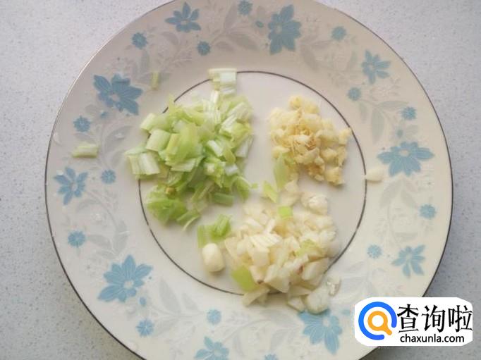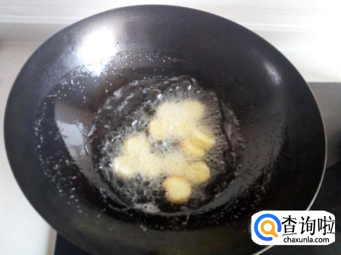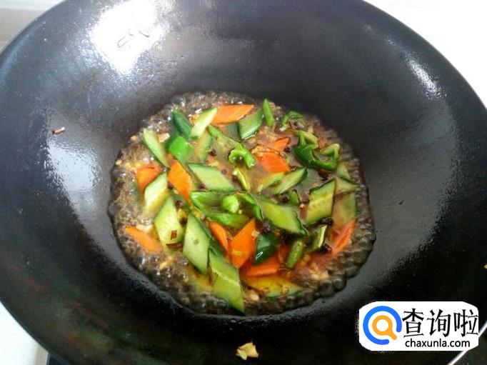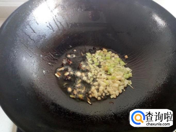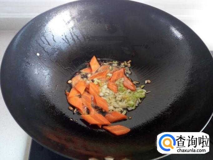 盛出多余的油,锅内留少许油加热。油热后放入花椒,葱,姜,蒜爆锅,放入胡萝卜片翻炒至变软。