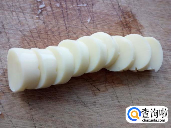 把买回来的日本豆腐,去除包装,用刀切成1公分左右厚的片,备用。