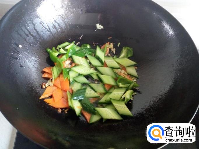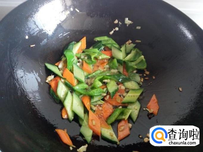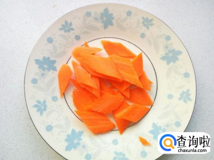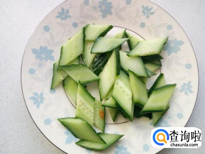 胡萝卜去皮,用水清洗干净,控干水分,切成菱形片。黄瓜用水清洗干净,控干水分,切成菱形片。