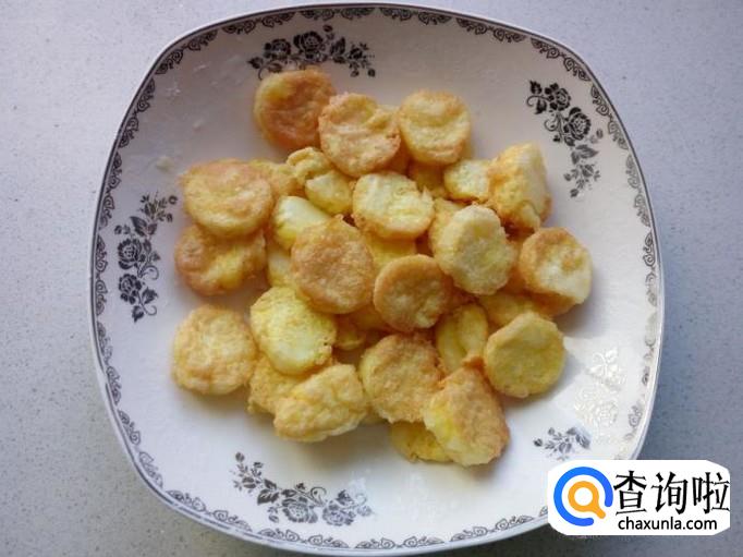 锅内放入稍多一些的油,加热,油热后用筷子夹起日本豆腐,依次放入锅中煎炸(一起倒入锅中,容易粘连一起)煎炸至颜色金黄,捞出备用。