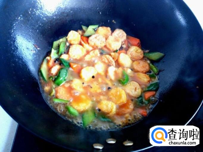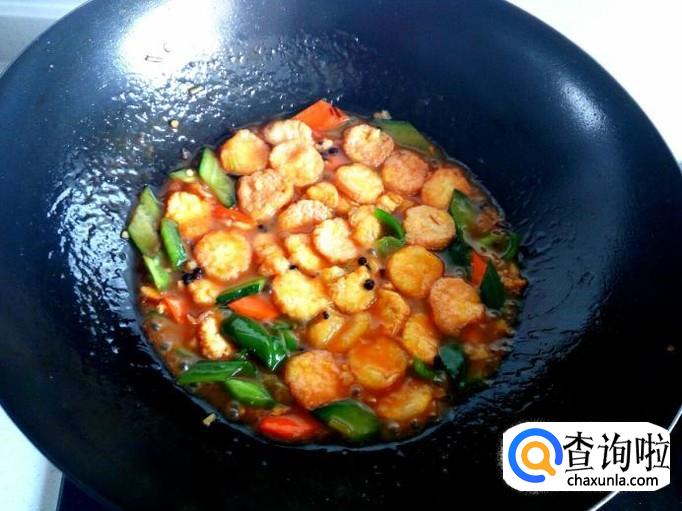 烧至少量汤汁时,倒入勾兑好的芡汁,芡汁粘稠后,关火出勺。