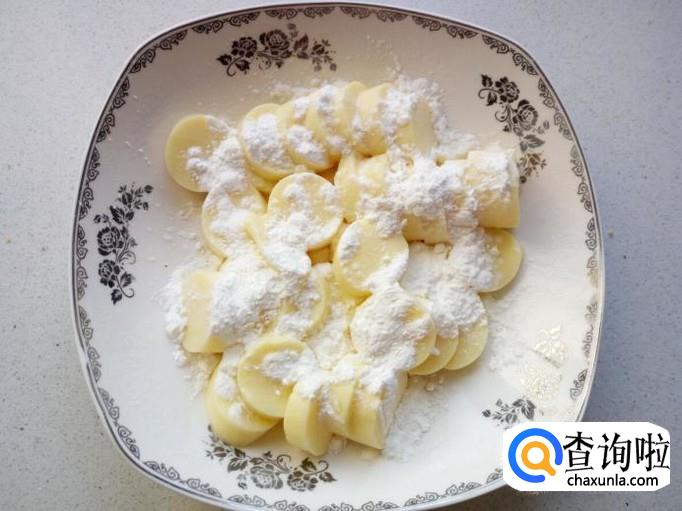 把切成片的日本豆腐,撒上干淀粉。晃动盘子,把淀粉均匀开,尽量让日本豆腐都粘上淀粉。