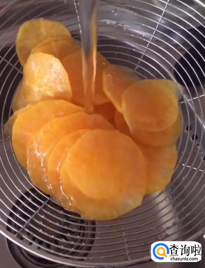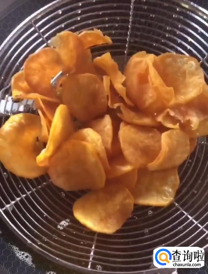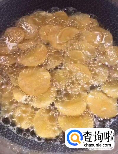 然后我们起锅烧油,油温五成热下入薯片小火慢炸,炸至金黄酥脆捞出控油