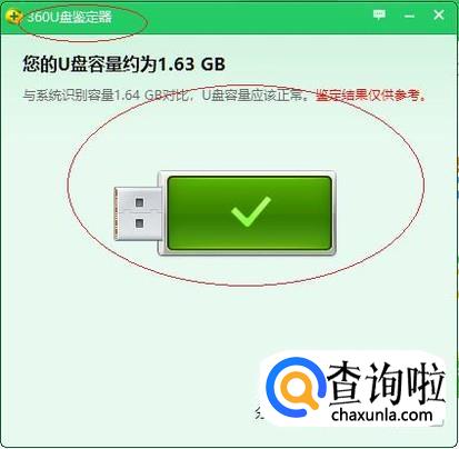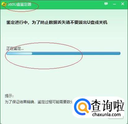如图所示,弹出"360U盘鉴定器"进度条。显示鉴定进行中,为了防止数据丢失请不要拔出U盘或关机。