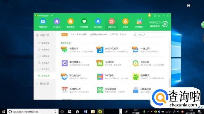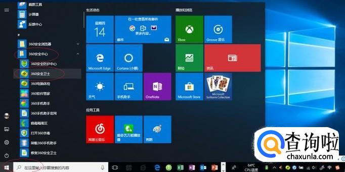 启动Windows 10操作系统,如图所示。点击任务栏"开始"按钮,弹出开始菜单选择"360安全中心→360安全卫士"项。